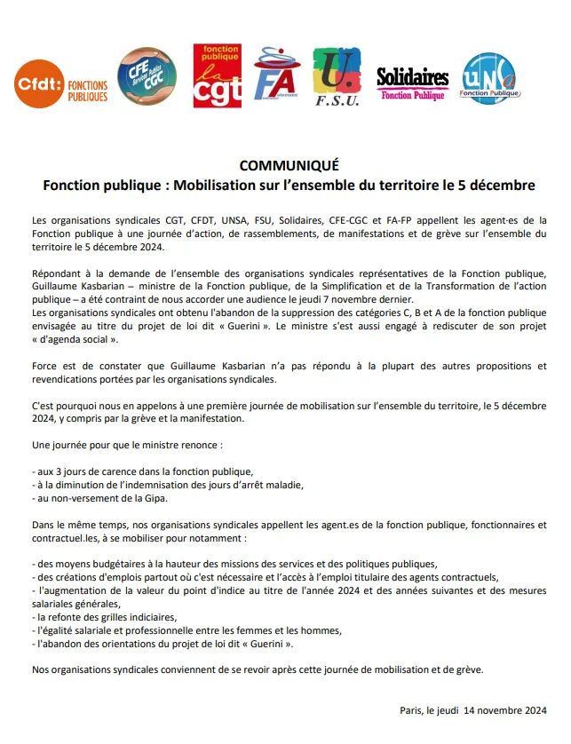 Vous trouverez ci-dessous le communiqué intersyndical de la Fonction Publique.